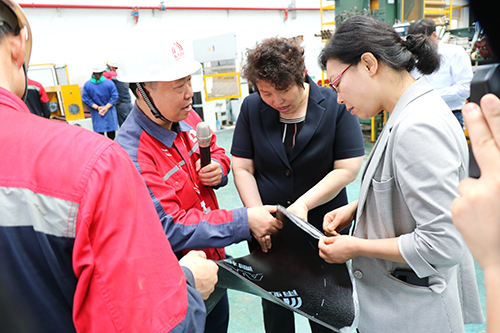 陽文新陪同調研團參觀了全自動控制的改性瀝青卷材生產線,并介紹了生產基地建設進度、生產經營和創新情況。劉峰梅對剛下線的卷材產品表現出濃厚的興趣,也表達了對東方雨虹的期許。