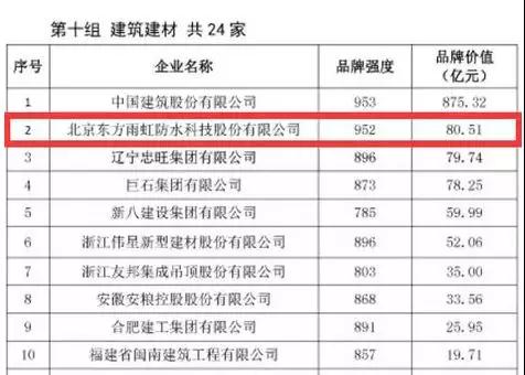 2018中國品牌價值排行榜:東方雨虹位居建筑建材類第二