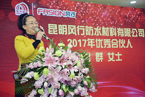 期間,公司還為2017年有突出貢獻的經銷商頒發了榮譽獎,為合伙人授予了“戰略合伙人”牌匾。優秀經銷商、合伙人代表付群女士致辭表示作為風行防水的合作伙伴,她將通過自身的努力讓更多的人感受到風行的真誠與超值的服務,更加支持與信賴風行。