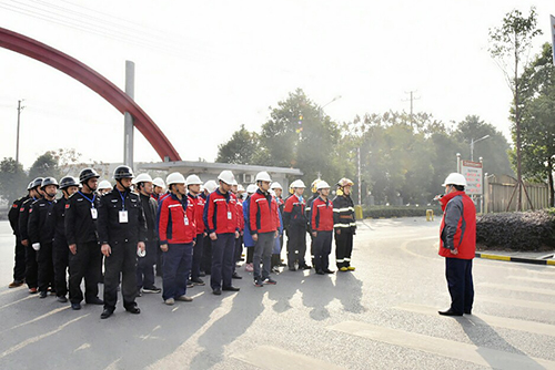 演習現場,隨著瀝青罐區的濃煙的升起,瀝青車間中控室立即啟動火災撲救及應急疏散預案,滅火行動組、疏散引導組、防護救護組及通訊保障組迅速就位開展火情控制、人員疏離和現場警戒等工作,云溪消防大隊官兵接到報警電話后火速抵達現場進行滅火救援。整場消防演習場面真實,開展滅火救援井然有序。
