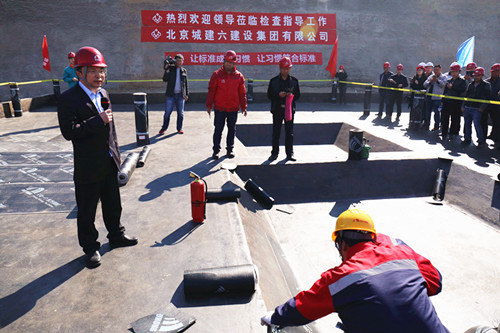 隨后,觀摩團還參觀了東方雨虹防水施工現場,實地觀看大面施工、陰陽角處理、搭接邊處理等具體操作演示。東方雨虹集團副總工程師許寧為觀摩團進行了詳細的步驟講解,并通過實際案例的對比,闡明標準化施工的必要性和質量優勢,獲得了觀摩團的一致好評。