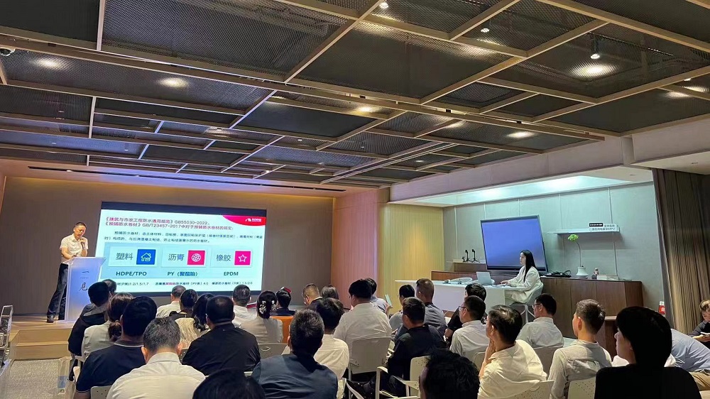 東方雨虹工建集團江蘇公司總工程師徐方賓作《建筑底板防水新材料應用分析》主題分享,他圍繞《建筑與市政工程防水通用規范》,系統分析底板HDPE、底板R類橡膠卷材、底板PY類瀝青卷材及底板其他類卷材預鋪反粘應用的方案及優劣勢。他強調,通過改進防水材料的抗穿刺、抗沖擊等性能及防水施工工法,可以去掉不必要的結構層次,增加防水層的可靠性。