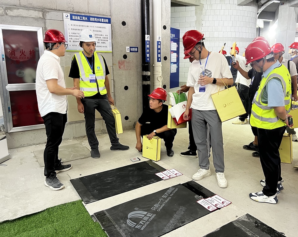 活動現場,東方雨虹技術人員詳細講解金屬屋面TPO等產品的性能優勢、環保特性及應用場景,并將材料選擇、安全規范、施工工法等影響工程效果關鍵因素融于底板、側墻、頂板防水施工打樣展示。此外,通過操作智能卷材攤鋪機、聚氨酯噴涂機等設備,全方位呈現其功能與特性,讓現場觀眾近距離感受產品的獨特性。